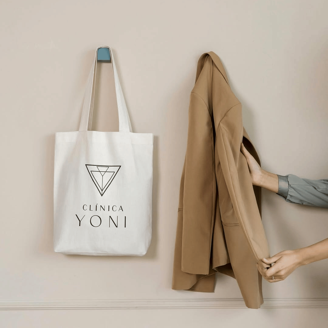 Clássica e elegante, a identidade visual da Yoni traz cores neutras e formas geométricas clássicas.